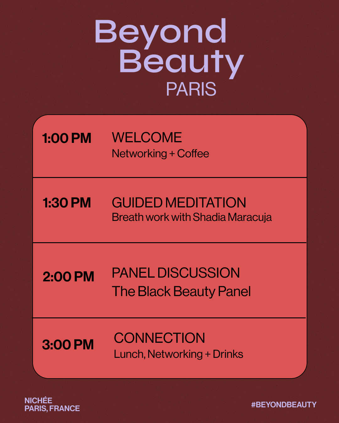 Hosted at Nichée Coffee Shop - a Black woman–owned cafe, the event will feature a guided meditation led by Shadia Maracuja, followed by a powerful discussion with: